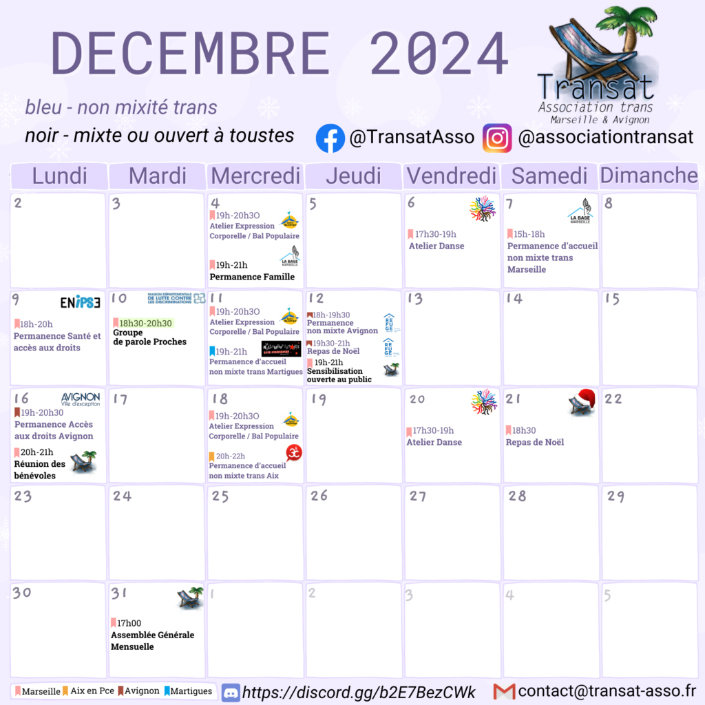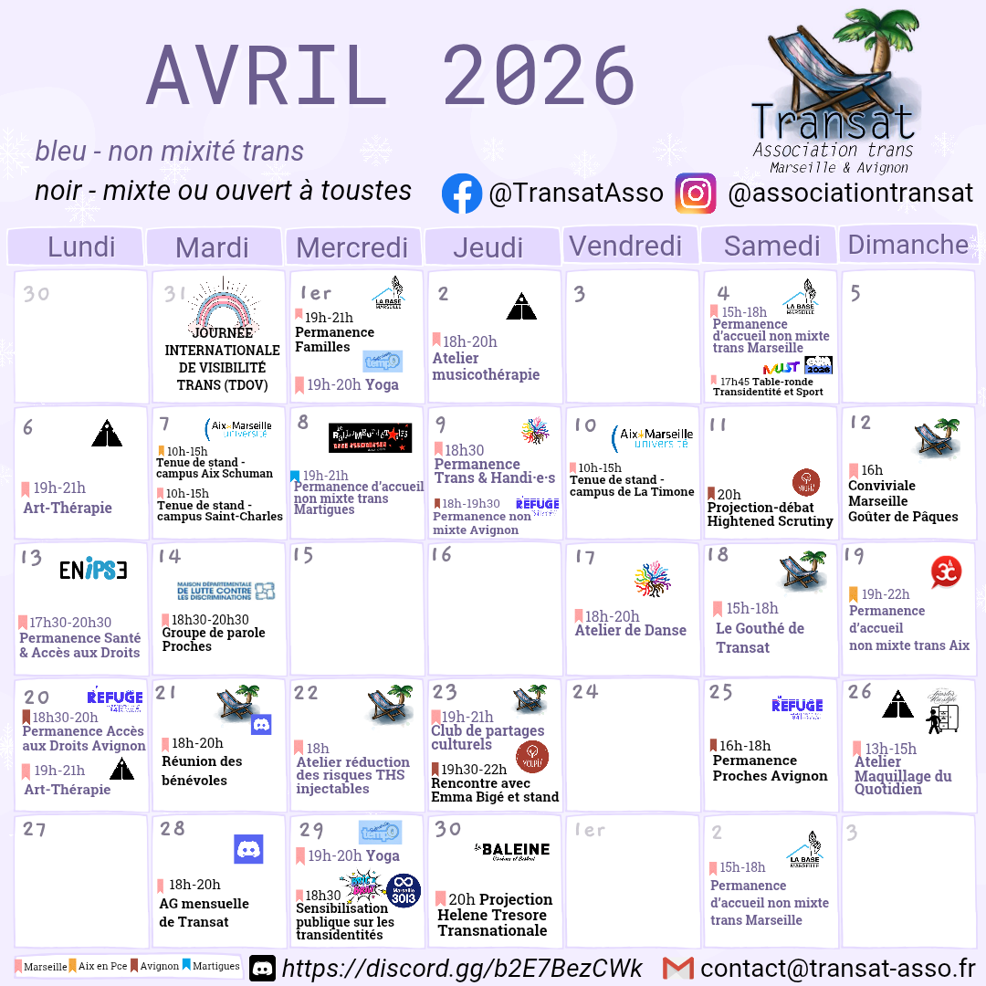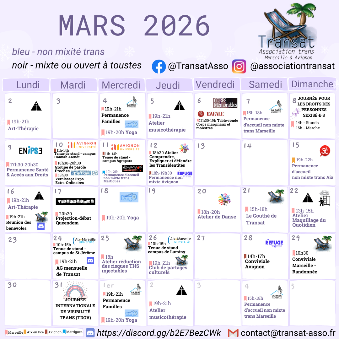L’association Transat est une association de personnes trans, à visée militante et d’entraide, basée sur Marseille, Avignon et leurs environs.